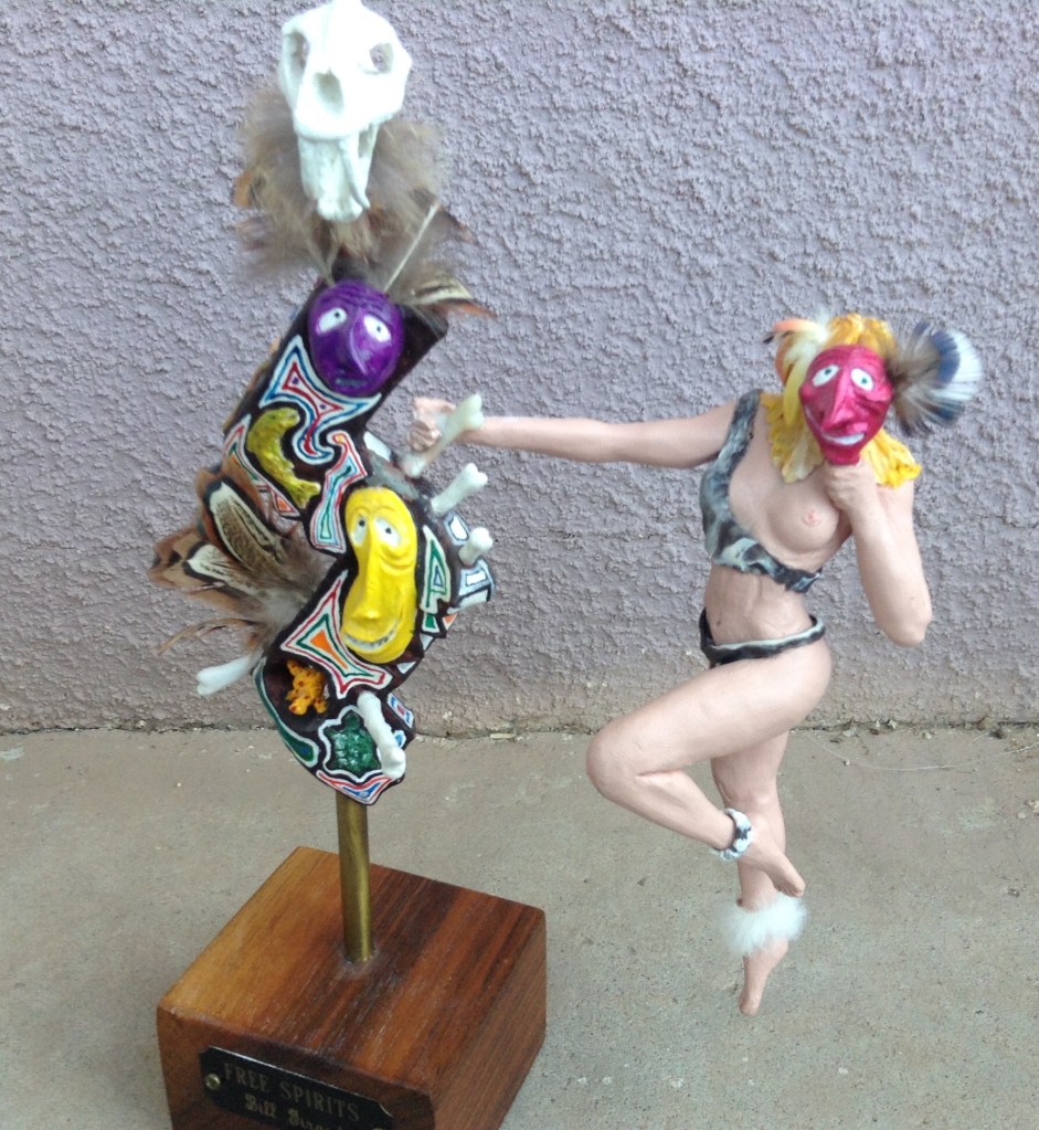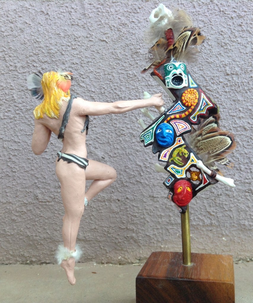 Last week while wandering the same shop, I came across what at first looked like the legs of a Barbie doll. Only these were in proportion to the real world. They were attached to a clay figure that was obviously made by a very talented artist. Upon close examination the fingerprints of the artist were discernable in the clay. The lady was dressed in a falling bikini and holding a Iroquois false-face mask over her (missing) face. The form of the figure was incredible; even though it was made of clay it had an vibrant life of it’s own. I admired the detail and love that went into this creation. The sculpted and painted hair was topped with cascading feathers that blended beautifully.